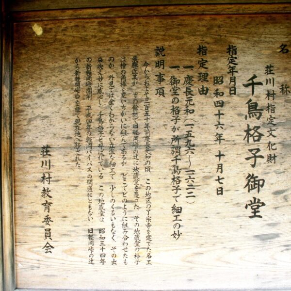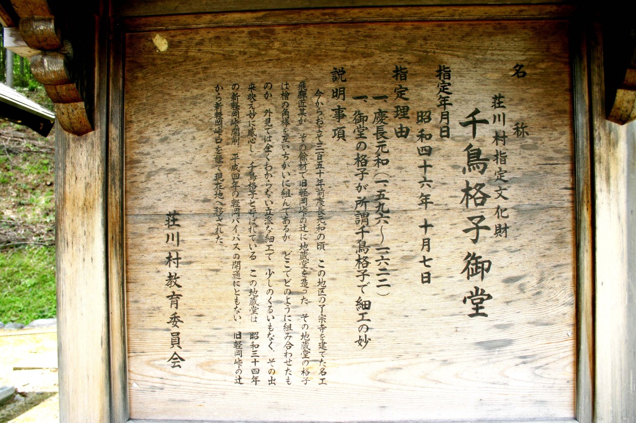 国道158号線沿いの簡易パーキングで、あずまややトイレがある憩いの広場です。施設内には、約350年前に高山市荘川町六厩にある了宗寺建立の余材で建てられたとされる「千鳥格子細工の地蔵堂」があり、重要文化財にも指定されています。この扉の格子は、昔の飛騨の匠の作で、その手法を解ける人はいなかったともいわれる不思議な格子です。