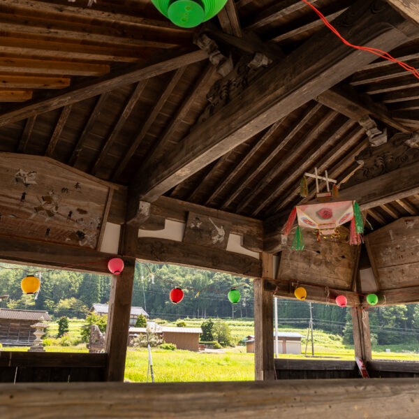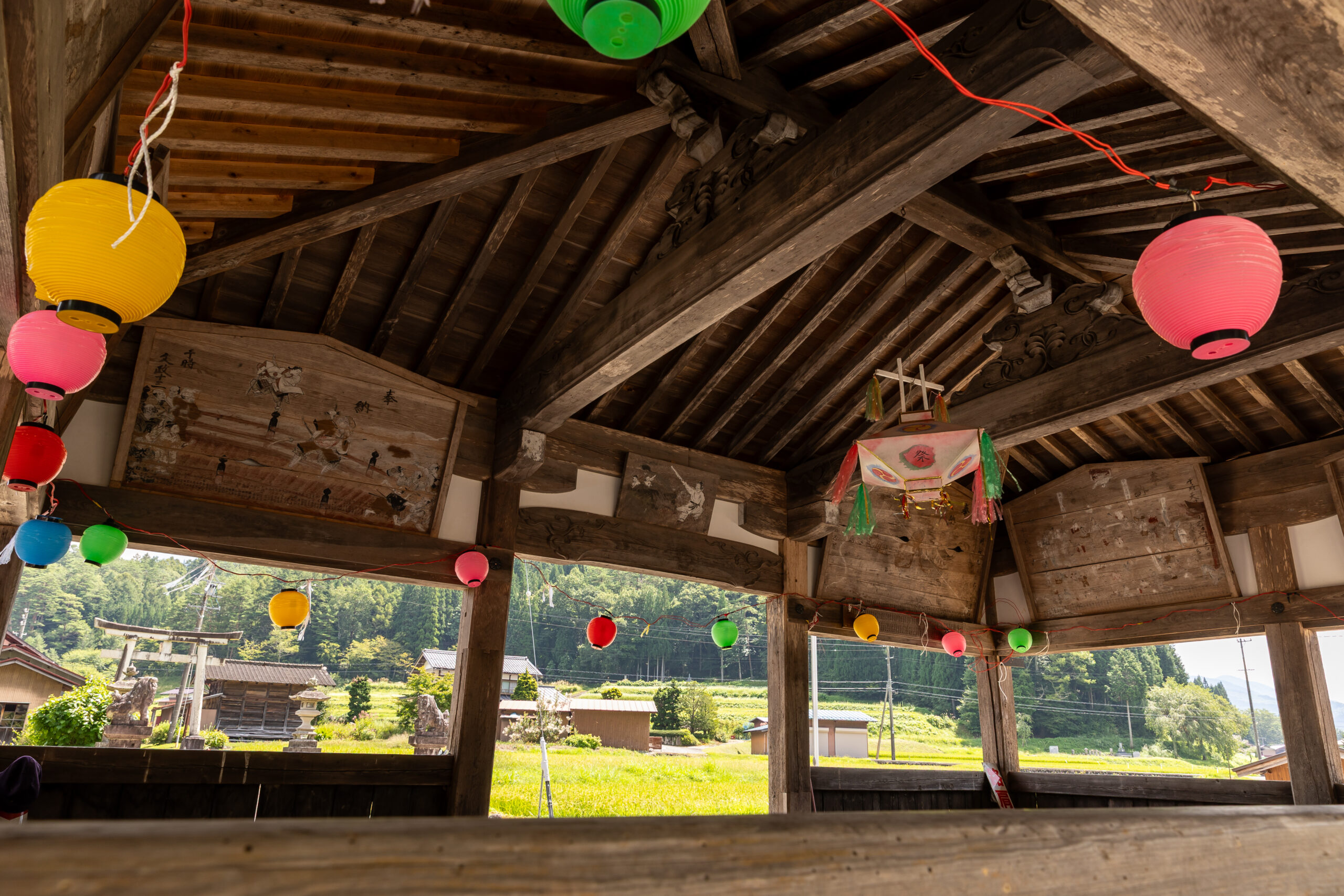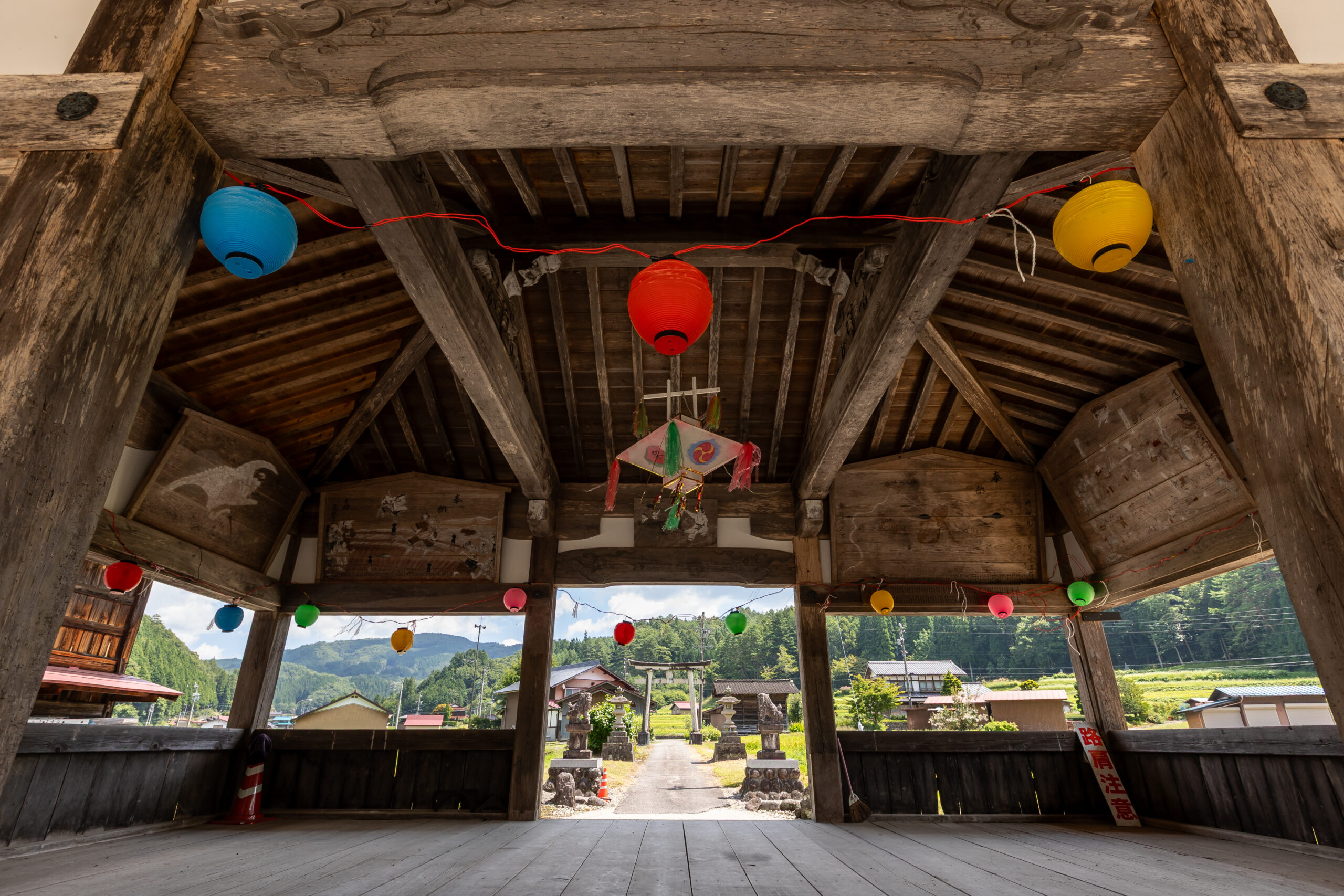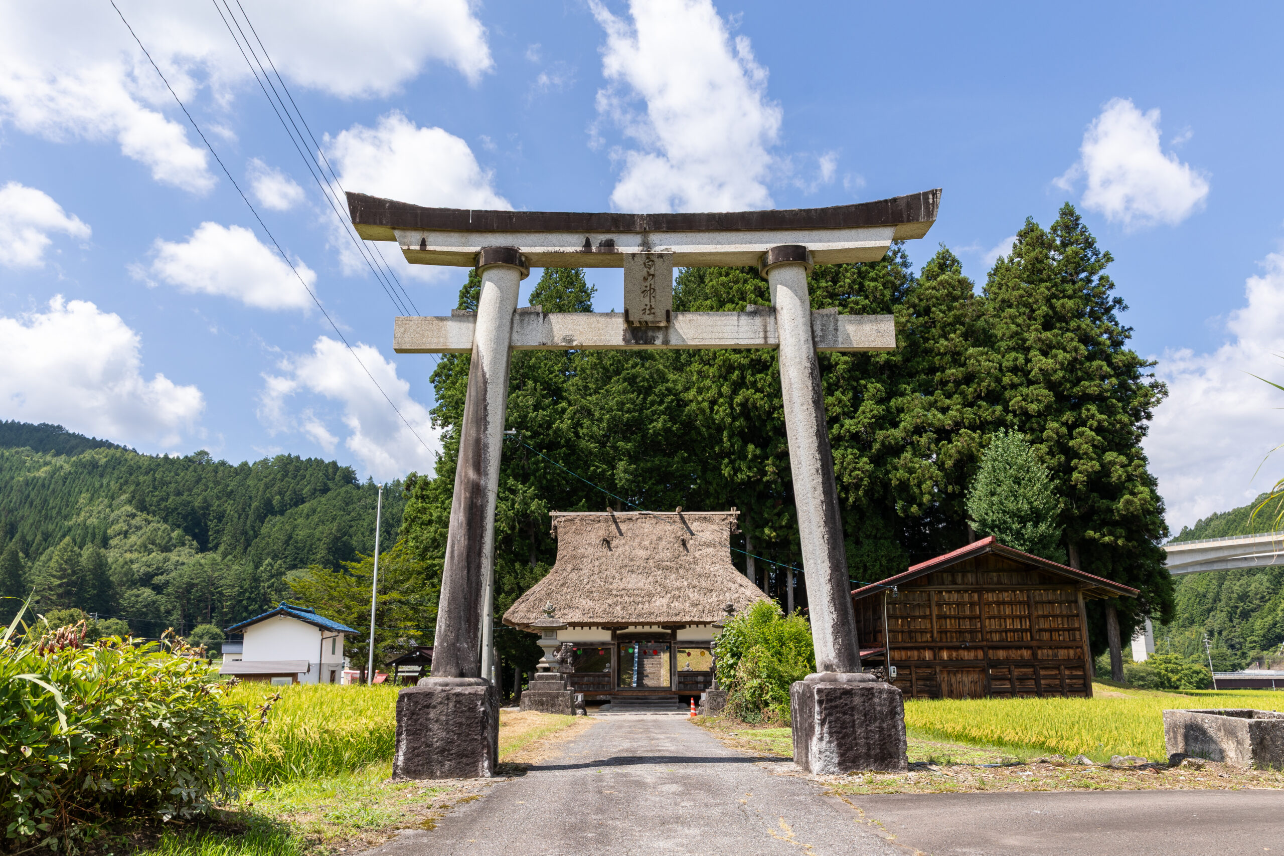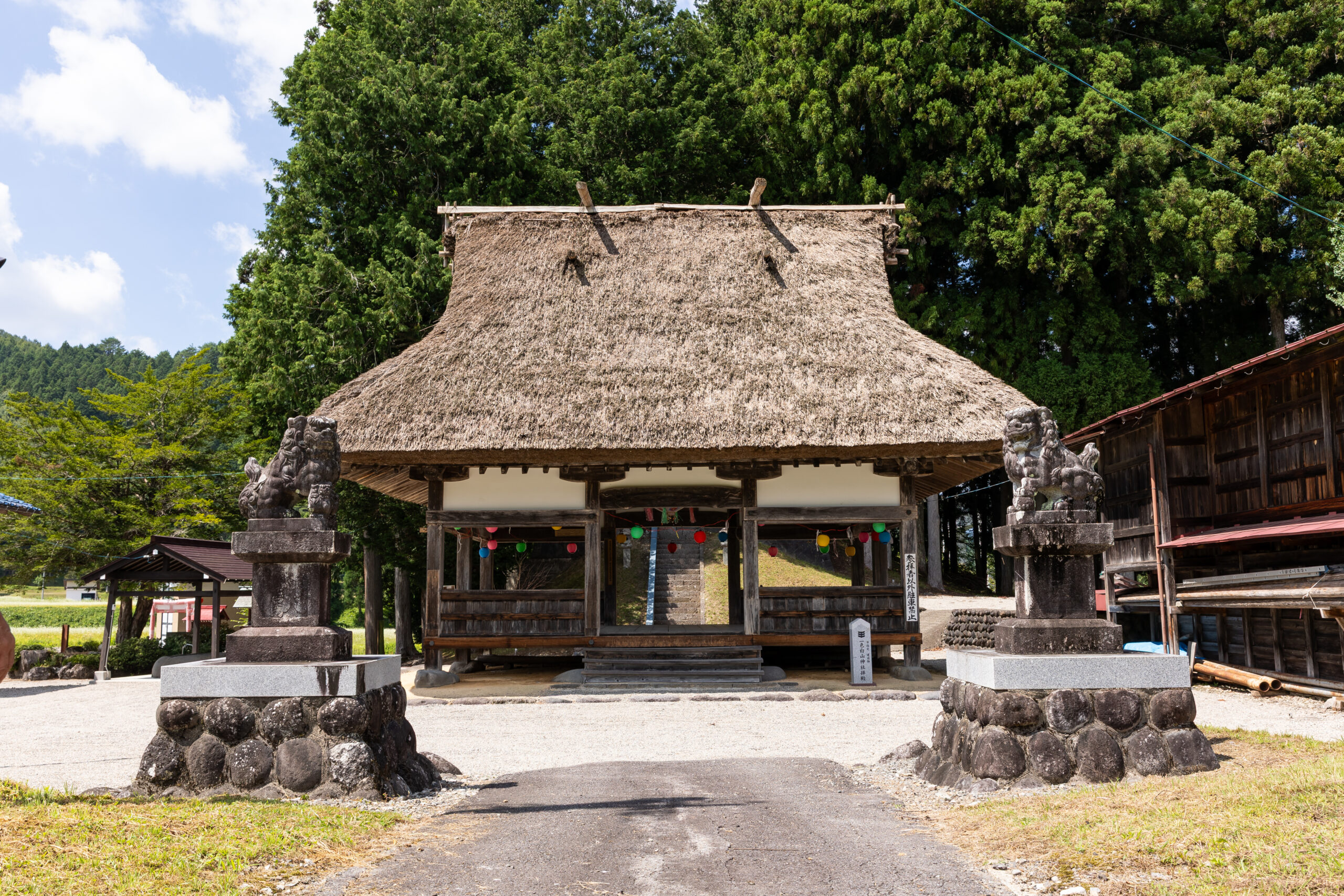 古くから白山信仰が根付く荘川地域に7社ある白山神社の一つです。安永4年(1775年)9月に造営された入母屋茅葺き屋根の古い建築様式の拝殿は、高山市の有形民俗文化財にも指定されています。四方が吹き抜けになっていて、緑豊かな山々と稲田の広がる長閑な山村風景の中に溶け込む姿に、風情豊かな趣を感じられます。