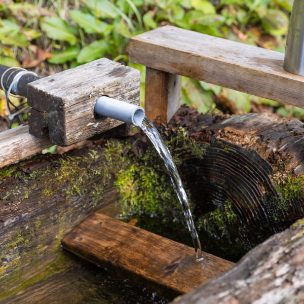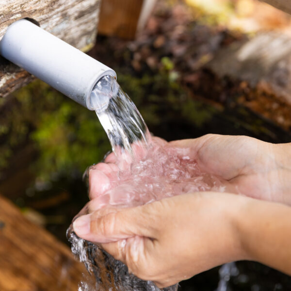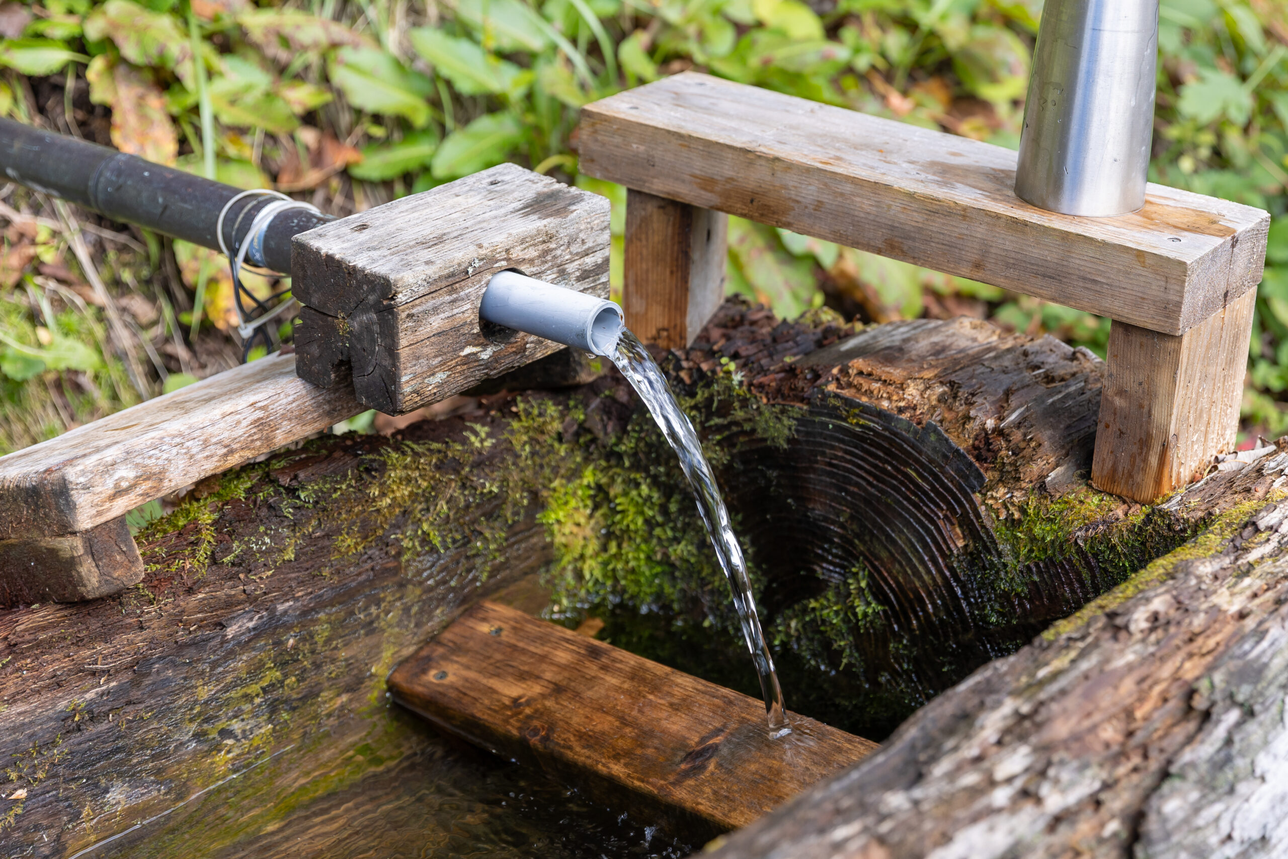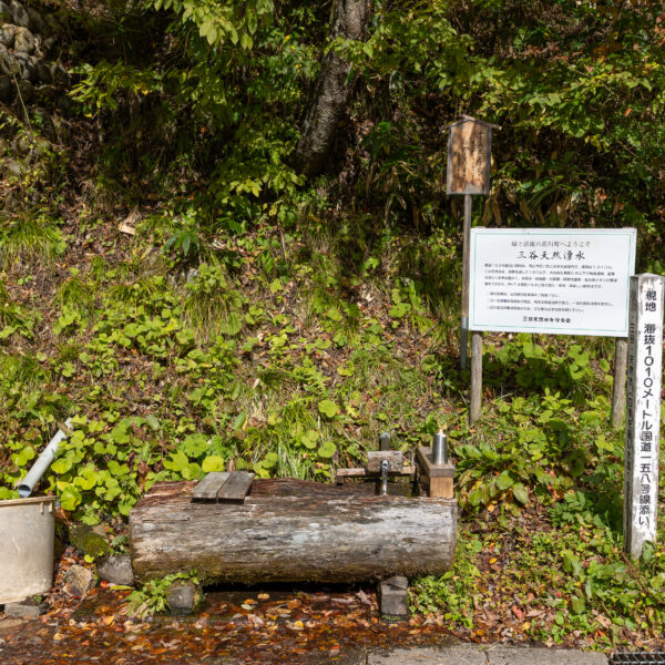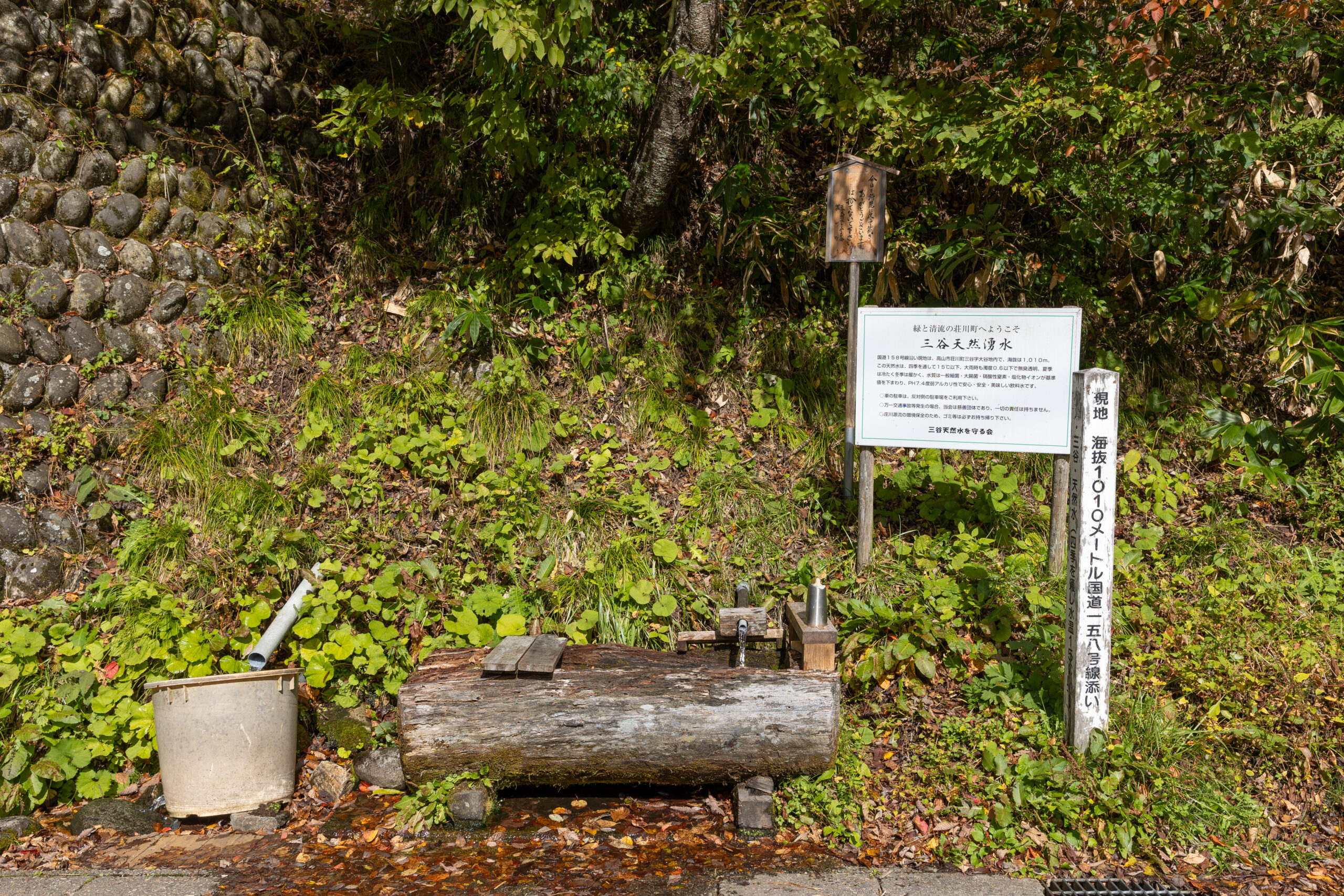 国道158号線沿い、海抜1,010mの場所にある天然の湧き水。水温は四季を通して15度以下で無色透明、夏は冷たく、冬は温かく感じられるのが特徴です。水質はPH7.4度の弱アルカリ性。定期的に水質検査を実施している中、一般細菌等は基準値を下回っており、飲料水としても安心です。