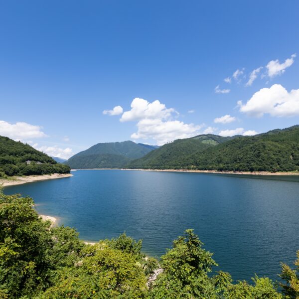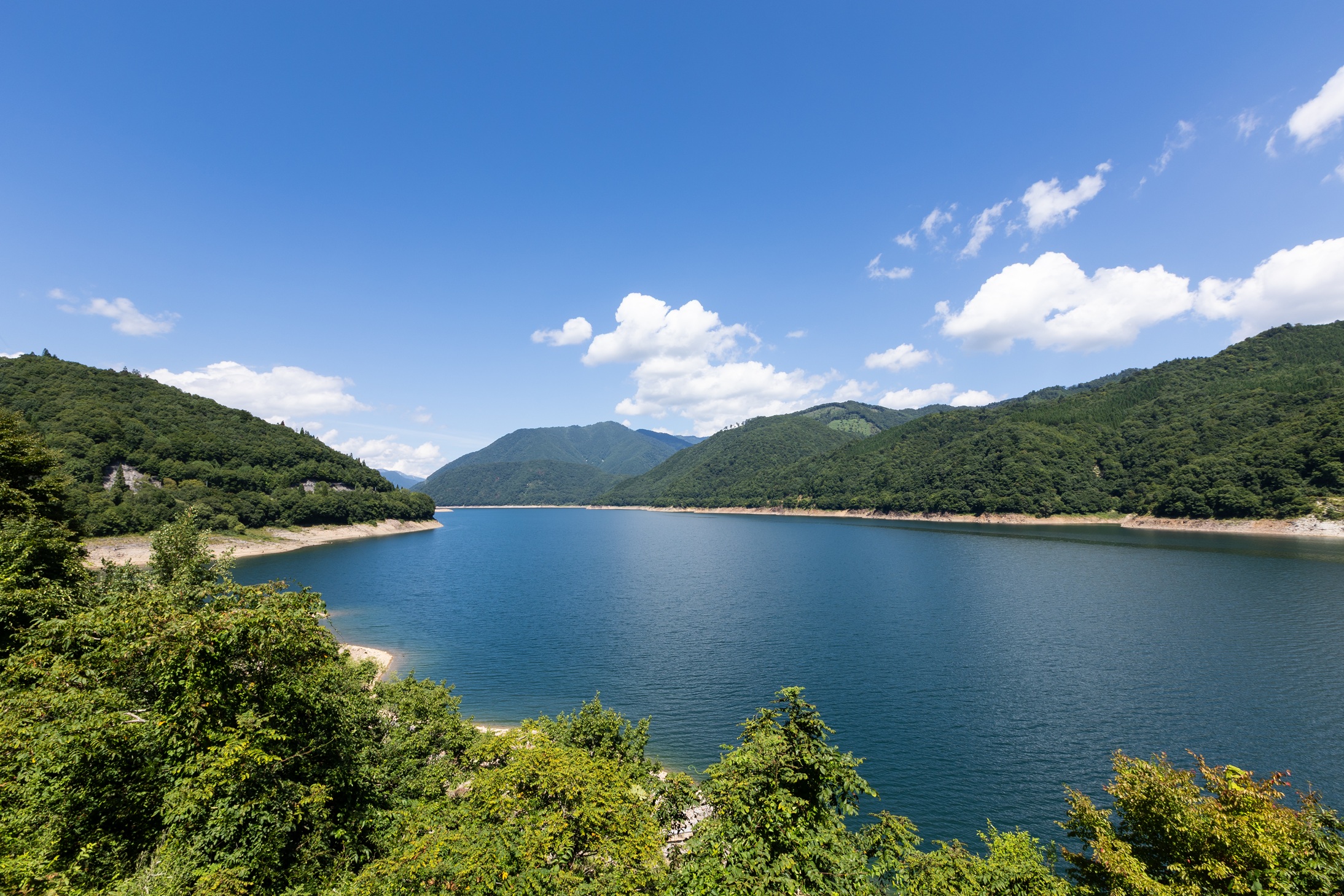 庄川をせき止めて造られた高さ131m、堤長405mの人造ダム。岩石や土砂を積み上げて構築するロックフィル式ダムとしては日本屈指の大きさを誇ります。
